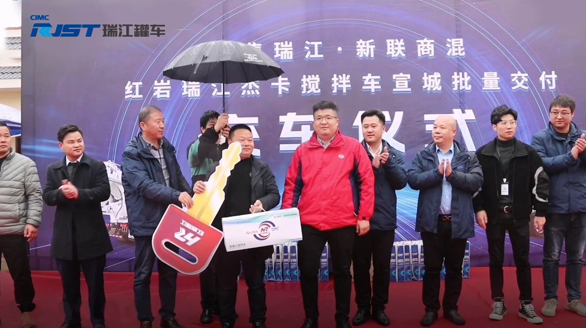3月1日,红岩瑞江搅拌车批量交付新联商品混凝土有限公司,宣城新联董事长陈昌群先生、上汽依维柯红岩商用车有限公司安徽市场部经理杨龙先生、芜湖中集瑞江汽车有限公司安徽大区经理刘杰、安徽鑫瑞江汽车销售有限公司总经理董育鑫先生等领导嘉宾出席交车仪式。
