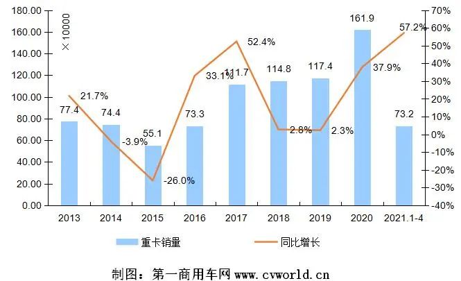 根据第一商用车网初步掌握的数据,2021年4月,我国重卡市场预计销售各类车型约20万辆(开票销量口径,非终端实销口径),环比下降13%,同比上涨5%。今年1-4月,重卡市场累计销售超过73万辆,比上年同期增长57%。