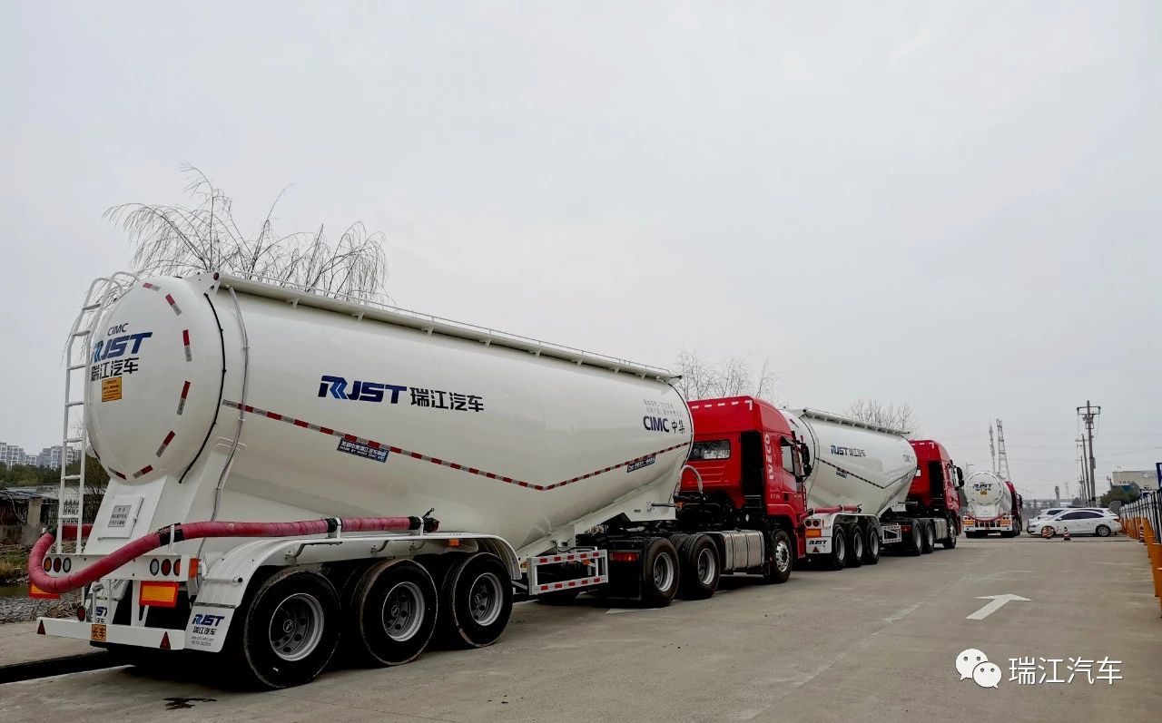 停靠中集瑞江厂区内的批量高强度轻量化粉罐车正在接受客户检阅,静待启程。此批粉罐车是中集瑞江率先推出的无滑料板结构,罐体选用高强度钢,附件采用铝合金材料匠心雕琢的轻量化精品。此款粉罐车出料速度快,剩余率低,远超同类产品,高品质、安全性更是获得广泛好评。