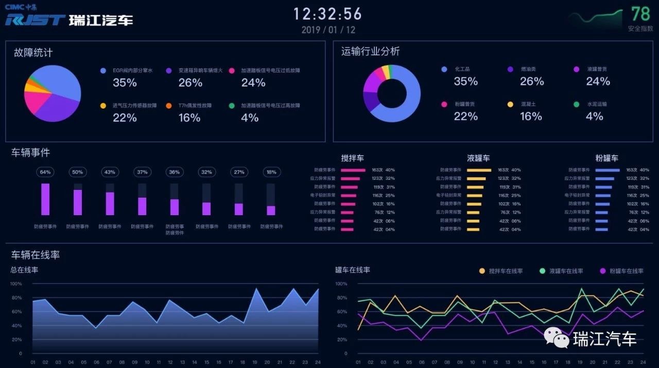 中集瑞江智能罐车可以通过搭载物联网和智能云平台(RJST-IOT),自动为管理系统生成车辆载重、车速、里程、油耗、成本等信息报表,而且还可以为企业实时监控车辆各模块运行情况和核心零件(刹车、润滑系统)寿命情况,监测罐式车常见的容积、PH值、塌落度等专业指标,甚至远程调取车辆实时运行画面,通过人工智能的方式来实现真正的“智慧”物流生态和精准化实时管控。此外,还可以通过GPS/北斗定位系统,精准定位和APP实时保修,用数百辆流动服务车,开创了即时0距离服务和无条件移动服务的先河。