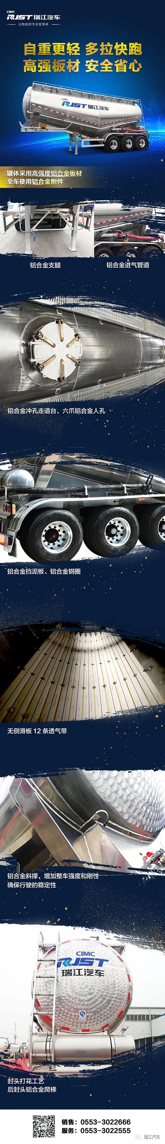 作为国内最早投入铝合金罐车研发和制造的企业之一,中集瑞江在铝合金罐车的技术运用、结构设计、制造工艺等方面积累了丰富经验和研发成果。以此为基础,通过全面调研粉粒运输的行业现状和用户需求,中集瑞江研发制造的全铝合金粉罐车以其高强度全铝合金罐体、全铝合金附件的轻量化、安全性优势迅速吸引客户眼球,近年来成为热销车型。